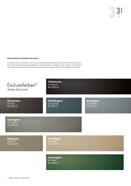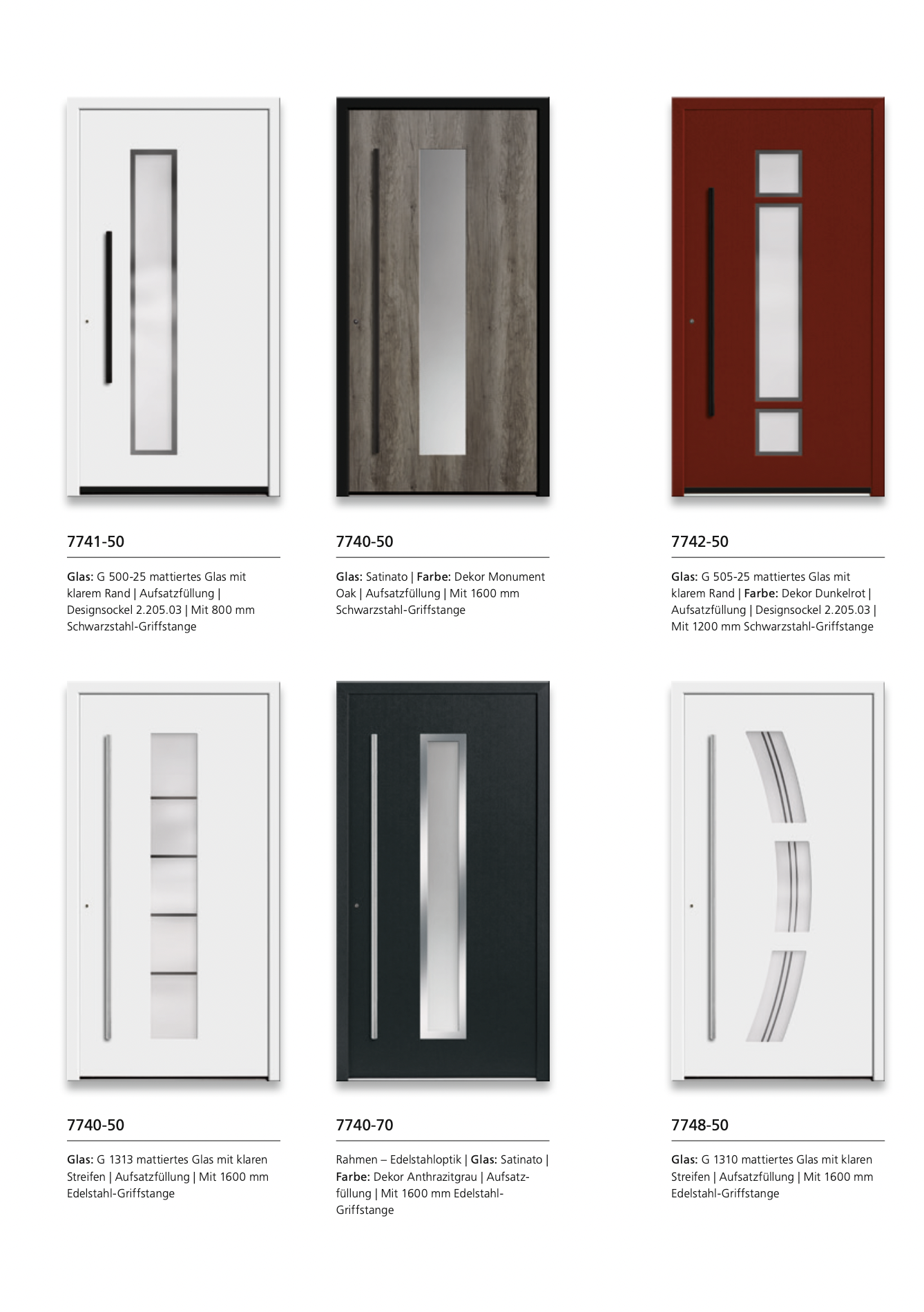 Sie sind leicht und langlebig und in verschiedenen Farben und Oberflächen erhältlich. Aluminiumtüren bieten eine gute Wärmedämmung und sind oft mit Glasfüllungen kombiniert.
